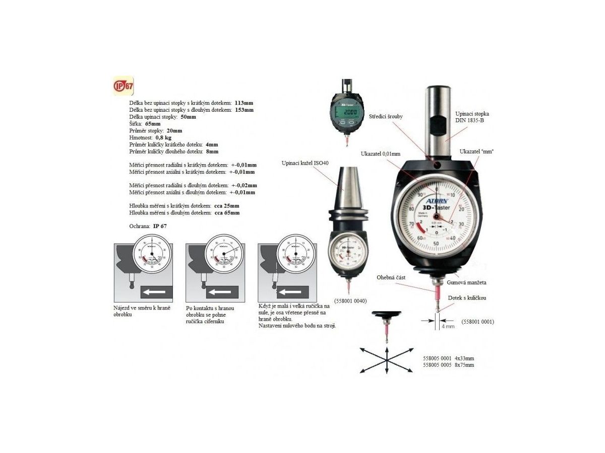 - Poznámka:3D-taster je přesné a mnohostranně použitelné měřidlo pro frézky a jiné stroje. S pomocí 3D-tasteru můžeme rychle a přesně nastavit vřeteno frézky na obráběný kus nebo hranu přípravku, koordinační systém stroje nařídit a rozsahy měřit. 3d-taster je odolný nárazům a může být uložen v zásobníku nástrojů stroje.