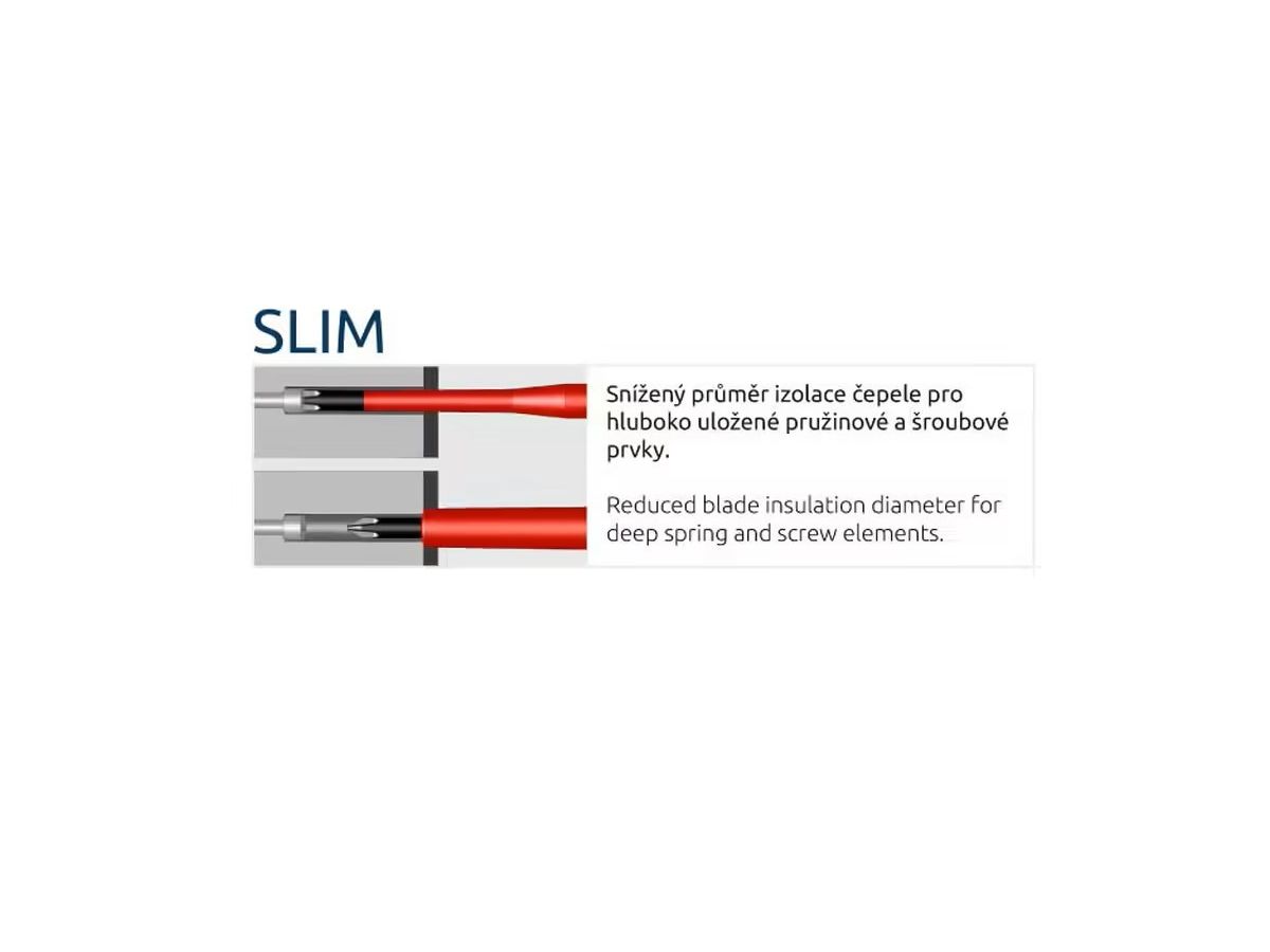 Snížený průměr izolace čepele pro hluboko uložené pružinové a šroubové prvky. Pro šroubováky od průměru dříku 3,5 mm.