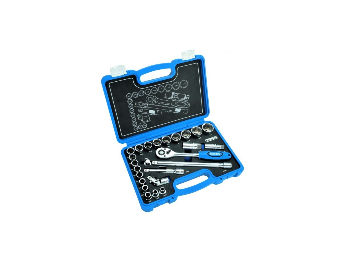 - Obsah sady: 18x 1/2 " 6hranné hlavice: 5/16 " - 3/8 " - 7/16 " - 15/32 " - 1/2 " - 9/16 " - 19/32 " - 5/8 " - 11/16 " - 3/4 " - 25/32 " - 13/16 " - 7/8 " - 15/16 " - 1 " - 1 1/16 " - 1 3/16 " - 1 1/4 ". 1x 1/2 " ráčna s přepínací páčkou. 2x 1/2 " prodlužovací nástavec 125, 250 mm. 1x 1/2 " vratidlo 250 mm. 1x 1/2 " univerzální kardan. 2x 1/2 " klíč na svíčky 5/8 " - 13/16 ".