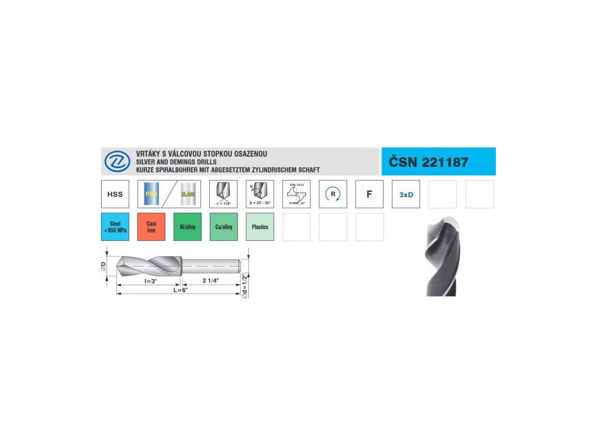 - Poznámka: Výkonné vrtáky doporučené pro běžné vrtání na automatických i revolverových soustruzích v součástkách z legované i nelegované oceli, ocelolitiny do pevnosti 900N/mm2, šedé, temperované i tvárné litiny, spékané oceli, hliníkové slitiny s krátkou třískou, bronzu, houževnaté mosazi.
