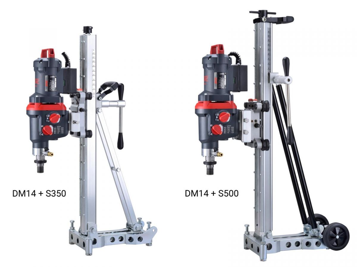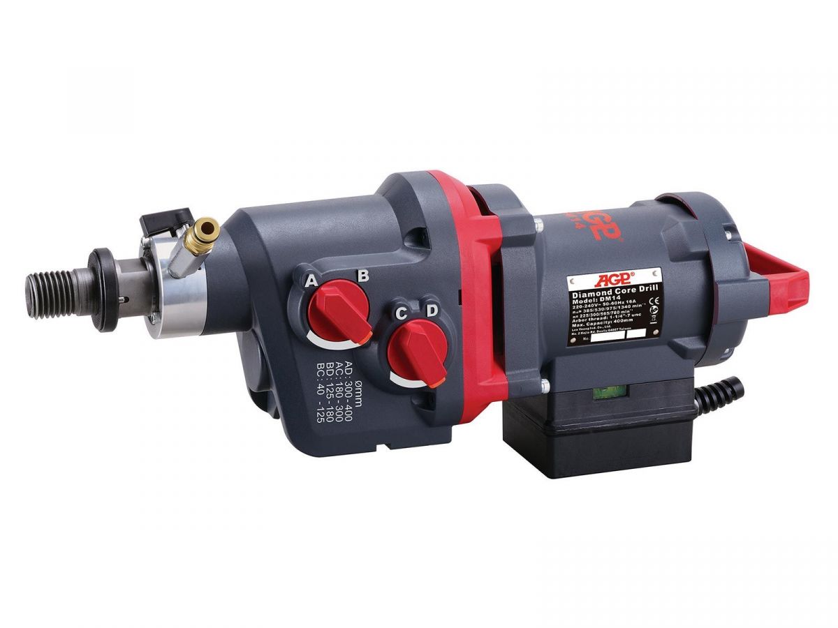 Profesionální, extrémně výkonná elektrická diamantová jádrová vrtačka DM14 pro nepřetržité ruční jádrové vrtání chemických kotev ke kotvení a otvorů na výztuže o průměrech do 400 mm. Tato diamantová jádrová vrtačka je určena pro mokré jádrové vrtání zdiva, betonu, železobetonu, přírodního kamene i cihel. Patří do řady extrémně výkonných elektrických vrtaček a je vyrobena pro nepřetržité profesionální použití.