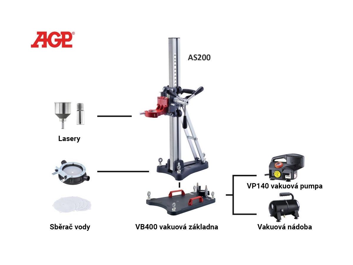 Stojan na vrtačku AS200 je ideální na všechny diamantové jádrové vrtačky s pistolovou i D rukojetí AGP, případně i vrtačky jiných výrobců. Maximální průměr neboli kapacita vrtání je 202 mm, s efektivním zdvihem 500 mm. Můžete jej také naklápět v úhlu až 45°.